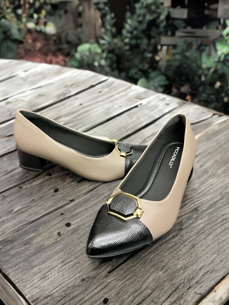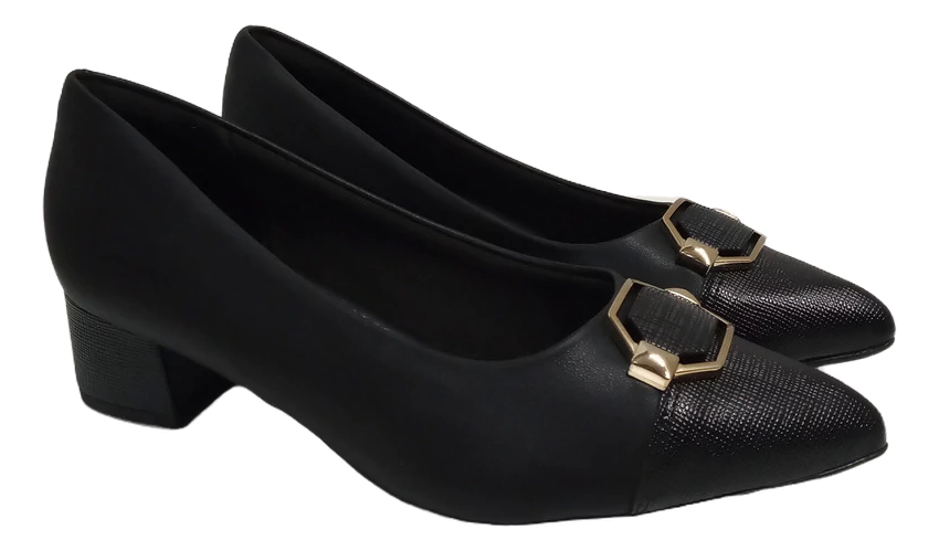 Confeccionado en material sintético de alta calidad, este modelo cuenta con un aplique en la punta que le da un toque de sofisticación. El tacón bajo lo hace ideal para uso diario, mientras que la suela de goma proporciona un buen agarre y durabilidad.