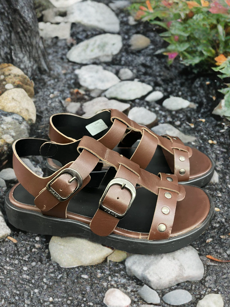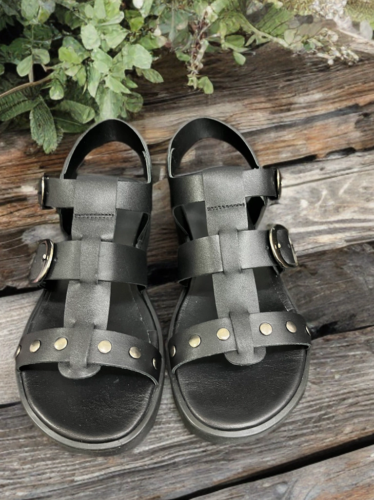 Sandalia romana de cuero con hebillas metálicas y remaches. Esta sandalia estilo romana está fabricada en cuero vacuno. Su base de goma resistente para el uso diario. Las tiras anchas se ajustan con hebillas metálicas, mientras que los remaches decorativos le aportan un toque moderno y con carácter. Horma estándar para calce cómodo y seguro. Ideal para combinar con prendas amplias, shorts o vestidos relajados.